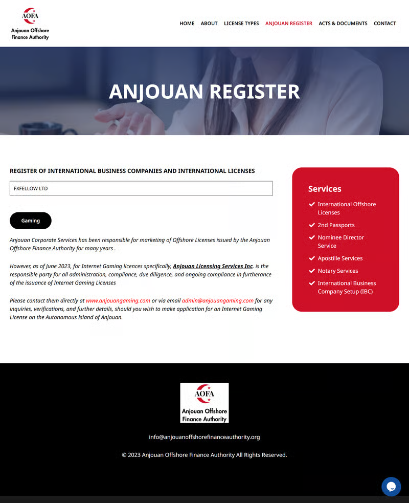 However, verification through the Anjouan Offshore Finance Authority (AOFA) database found no corresponding company record, suggesting that FXFellow’s claimed regulatory credentials are not verifiable.