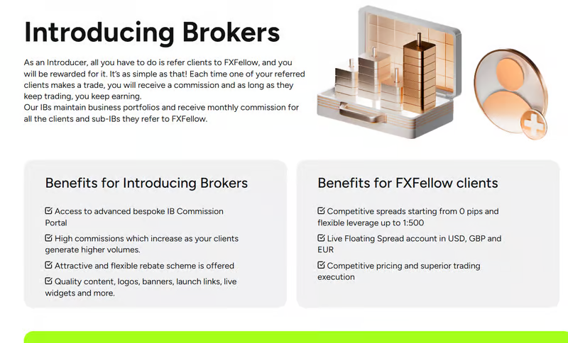 FXFellow promotes an Introducing Broker (IB) partnership program, where agents earn rebates from referred clients’ trading activities.