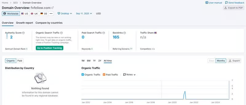 Data from Semrush shows that fxfellow.com receives virtually zero monthly visits, implying no organic audience or active user base.