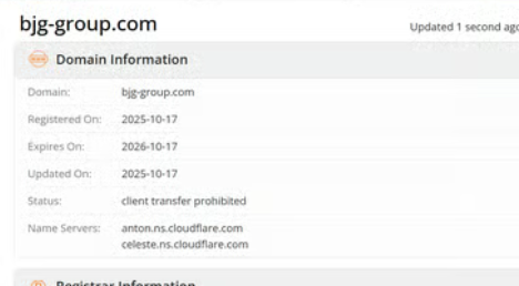 According to WHOIS records, BJG’s official domain — https://bjg-group.com — was registered on October 17, 2025, and last updated on the same date.