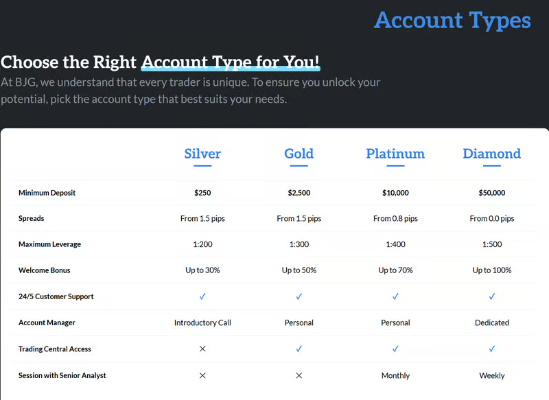 BJG offers four main account tiers aimed at different investor levels: