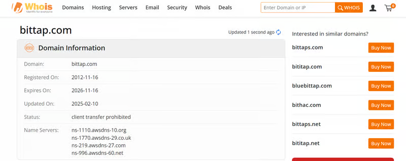 BitTap operates through its official website at bittap.com. According to Whois records, this domain was registered on 16 November 2012 and last updated on 10 February 2025, suggesting a long registration history rather than a recently created URL.
