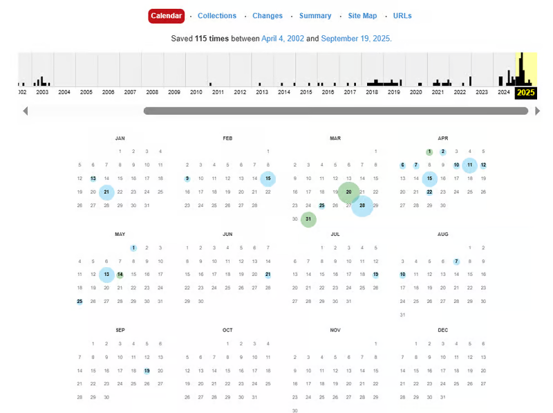 Data from the Internet Archive’s Wayback Machine shows 115 snapshots of bittap.com between 2002 and 2025. Early records are sparse, while captures increase significantly from 2024 onward, with 2025 showing activity in every month and especially dense snapshots in March and April.