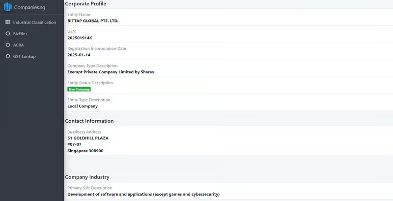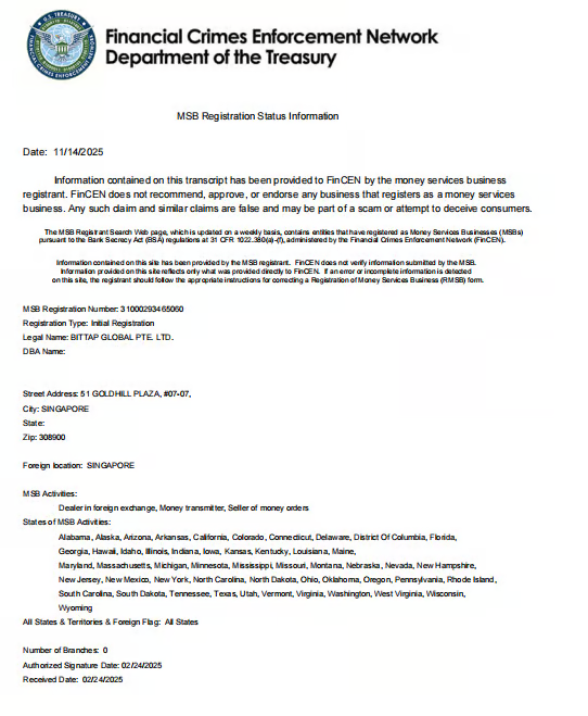 Checks on ACRA (Singapore) and U.S. FinCEN records show BITTAP GLOBAL PTE. LTD. listed with FinCEN MSB Registration Number 31000293465060. On paper, this confirms that the entity has registered as a Money Services Business.