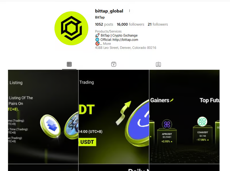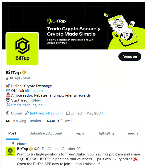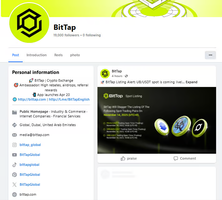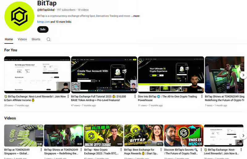 BitTap maintains official accounts on Instagram, Facebook, X (Twitter), YouTube, and LinkedIn, forming a wide cross-platform presence.