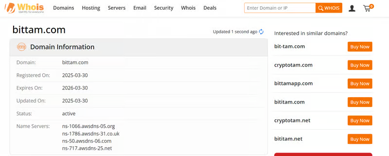 The domain bittam.com was registered on March 30, 2025, indicating that the platform is newly launched with no long-term operational record.