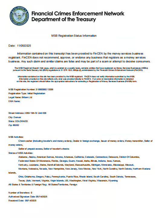 Bittam refers to MSB registration in the United States. However, MSB registration does not grant authorization to operate a cryptocurrency exchange and does not imply regulatory supervision or approval.