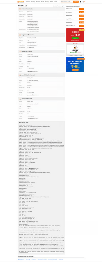 Public WHOIS data shows the domain bitloria.us was registered in late December 2025.