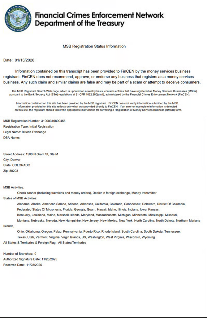 FinCEN has also clarified that MSB registration does not equal endorsement or official approval. If a platform implies that an MSB record represents regulatory authorization for global crypto trading services, that interpretation can be misleading.