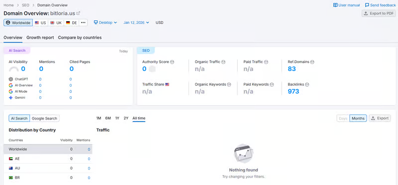 According to Semrush data, bitloria.us shows virtually no visible traffic, an authority score near zero, and consistently minimal visits. While backlinks may exist, the platform’s online activity does not appear to translate into actual exposure or measurable user activity.