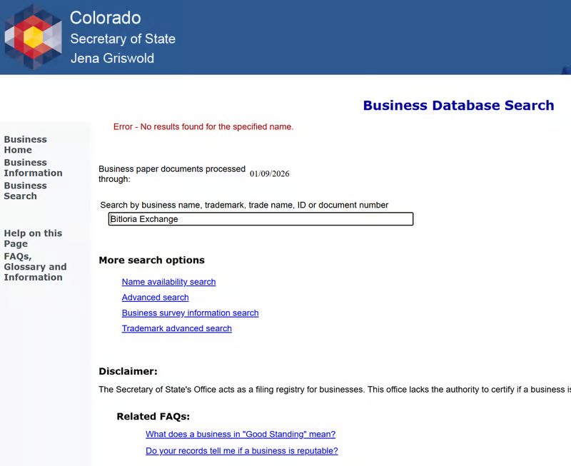According to the provided information, Bitloria or Bitloria Exchange-related company registration records were not found in the Colorado Business Database. This weakens the transparency of the platform’s corporate identity and makes it harder to verify legal responsibility through official channels.